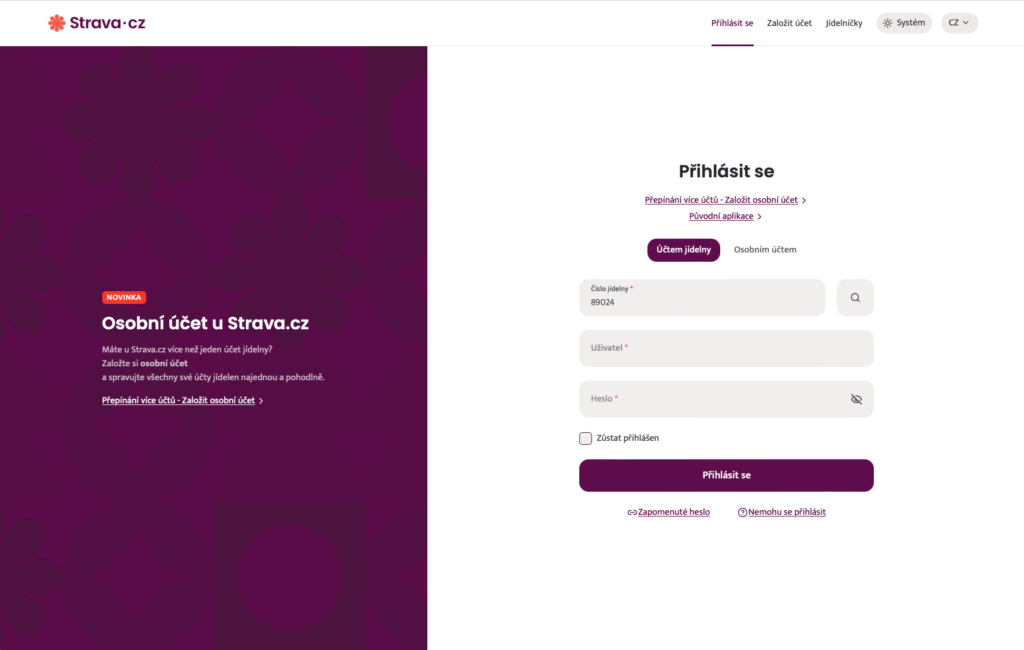 Zde zadejte přihlašovací údaje, které jste obdrželi na Vámi zadanou emailovou adresu, při nástupu ke studiu. K přihlášení k třídnímu fondu nezapomeňte vyplnit číslo jídelny 89024 (nejedná se o přihlášení ke stravování).