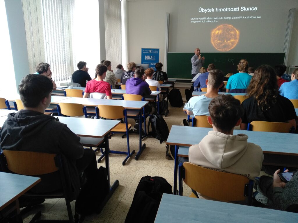 ČVUT v Děčíně pro naše žáky 2. ročníku zajišťuje již tradičně přednášku na téma Speciální teorie relativity. V letošním roce nám přednášel prof. Dr. Boris Tomášik. Žákům byly vysvětleny základní postuláty speciální teorie relativity, seznámili se také s jejich základními důsledky po teoretické a matematické stránce. Viděli též, v kterých reálných jevech se tyto důsledky projevují. Velkým přínosem pro všechny bylo zamyšlení se nad základními jednotkami (sekunda a metr) a technikou jejich měření.