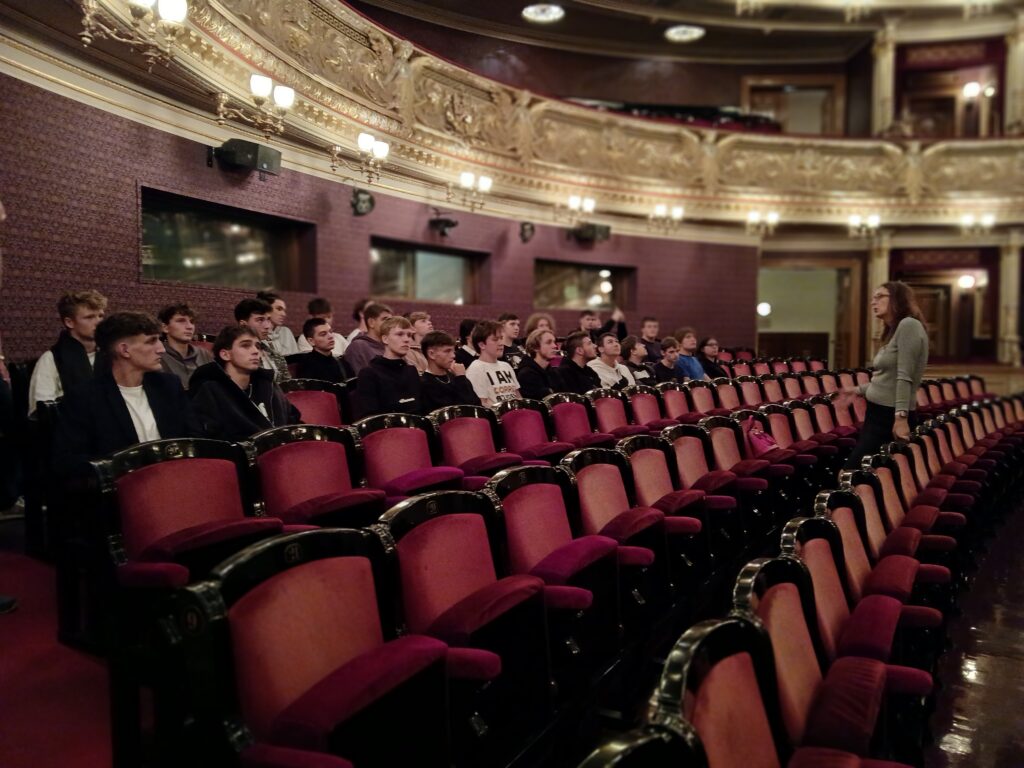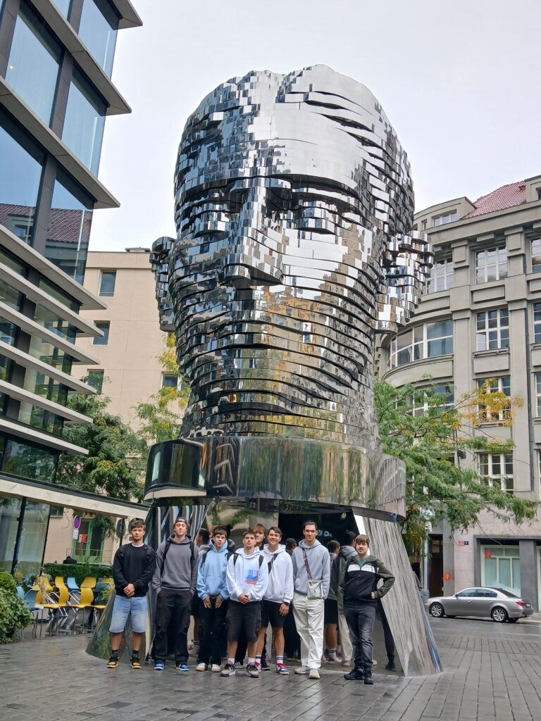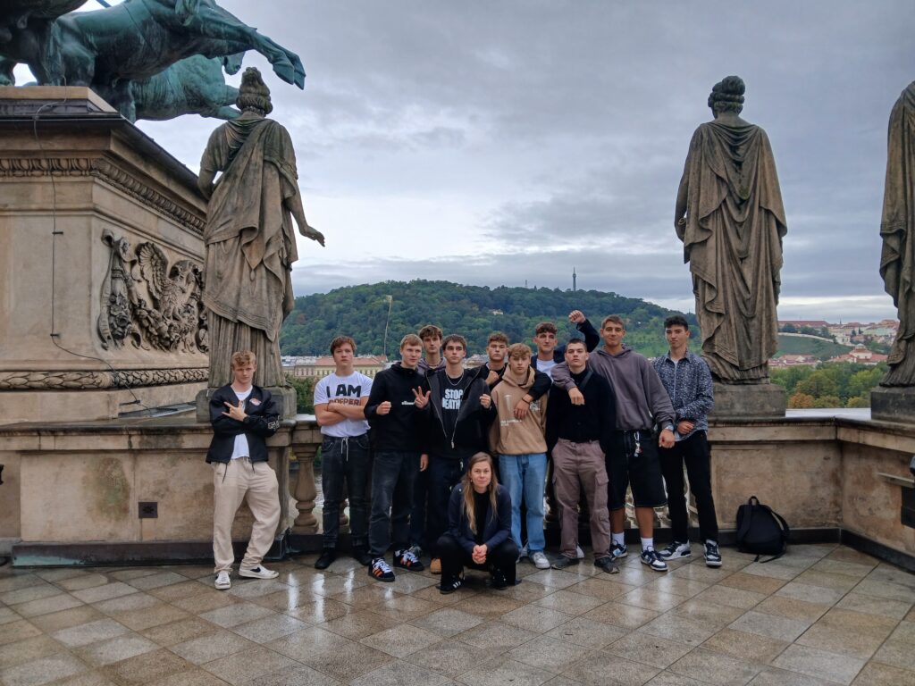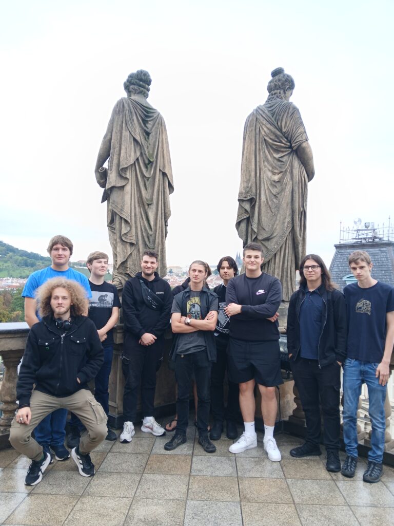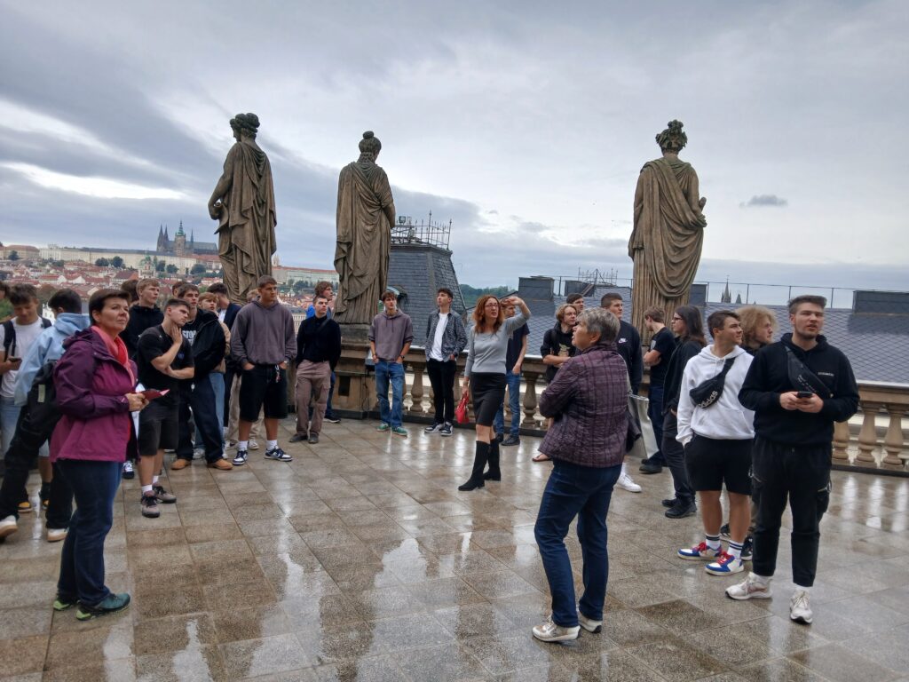 Ve čtvrtek 26. 9. se studenti tříd E3A, E3B a S3 vypravili na literární exkurzi do Prahy. Program byl zaměřený zejména na literaturu 19. století a komentovanou prohlídku Národního divadla v Praze. Cestou si studenti prohlédli současnou českou uměleckou tvorbu, například mechanickou sochu od výtvarníka Davida Černého vyobrazující Franze Kafku, nebo plastiku Srdce pro Václava Havla. Poté pokračovali k paláci Žofín a pomníku Boženy Němcové, kde si připomněli důležitou úlohu místa, které sloužilo v 19. století jako centrum společenského a politického života. Po přesunu zpět k Národnímu divadlu následovala komentovaná prohlídka s průvodkyní. Studenti si prošli divadlo od suterénu se základními kameny až po střechu. Dozvěděli se zajímavosti z historie budovy i technické detaily různých zařízení divadla. I když je téměř celou exkurzi provázel déšť, zvládli výlet na výbornou a kladně zhodnotili možnost podívat se do míst, kam se běžně veřejnost nedostane.