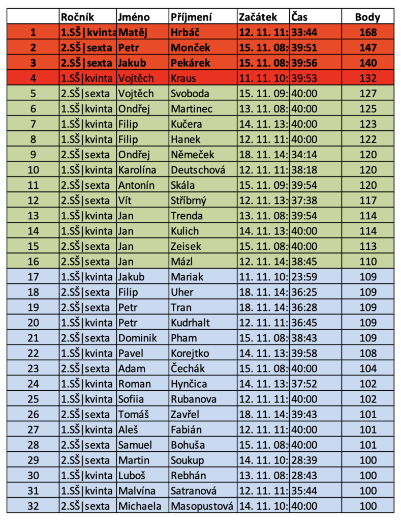 Zde je seznam a výsledky nejlepších z 250 soutěžících naší školy: