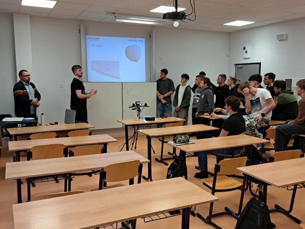 VOŠ a SPŠ Děčín Bc. Ferdinand Stodola, který v současné době studuje magisterské studium na Fakultě strojního inženýrství UJEP v Ústí nad Labem. Přednášejícího doprovodil pedagog fakulty