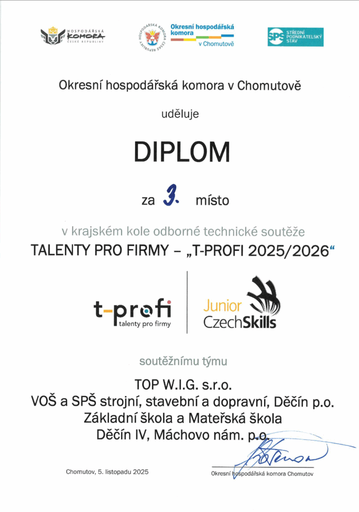 VOŠ a SPŠ Děčín a Okresní hospodářskou komoru Děčín reprezentovali žáci 2. ročníku oboru Elektrotechnika a Strojírenství, jmenovitě Jakub Němeček a Sebastian Toman ze tř. E2B
